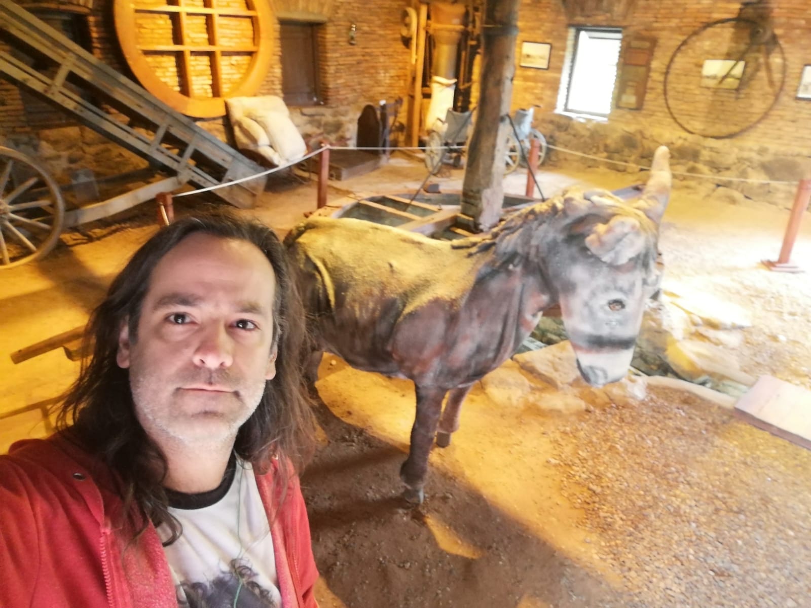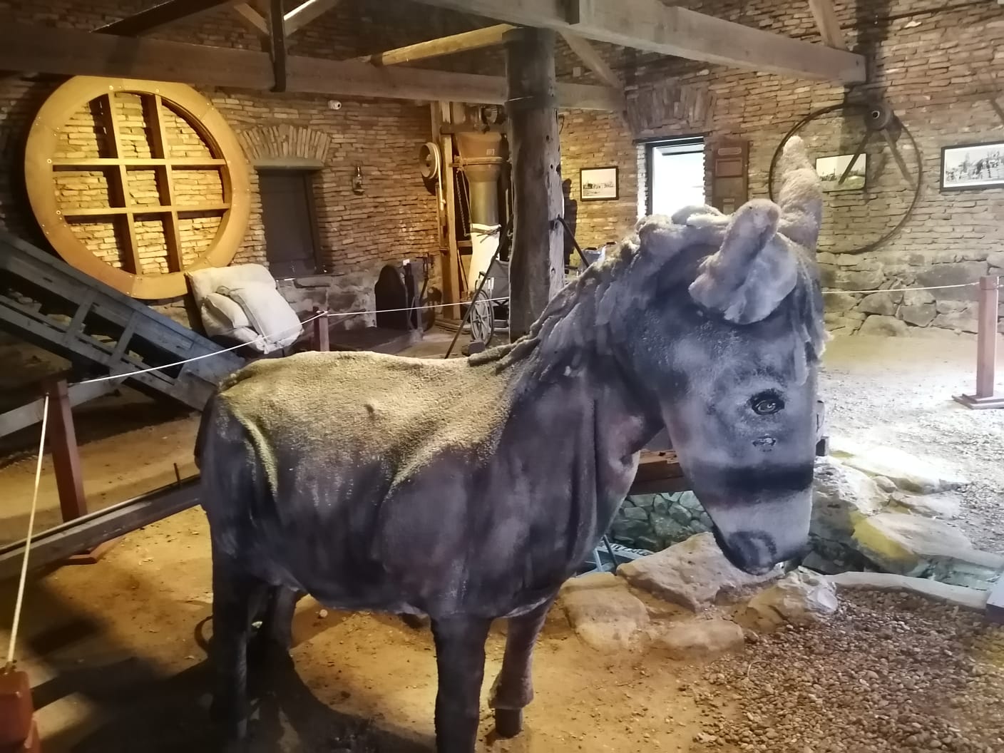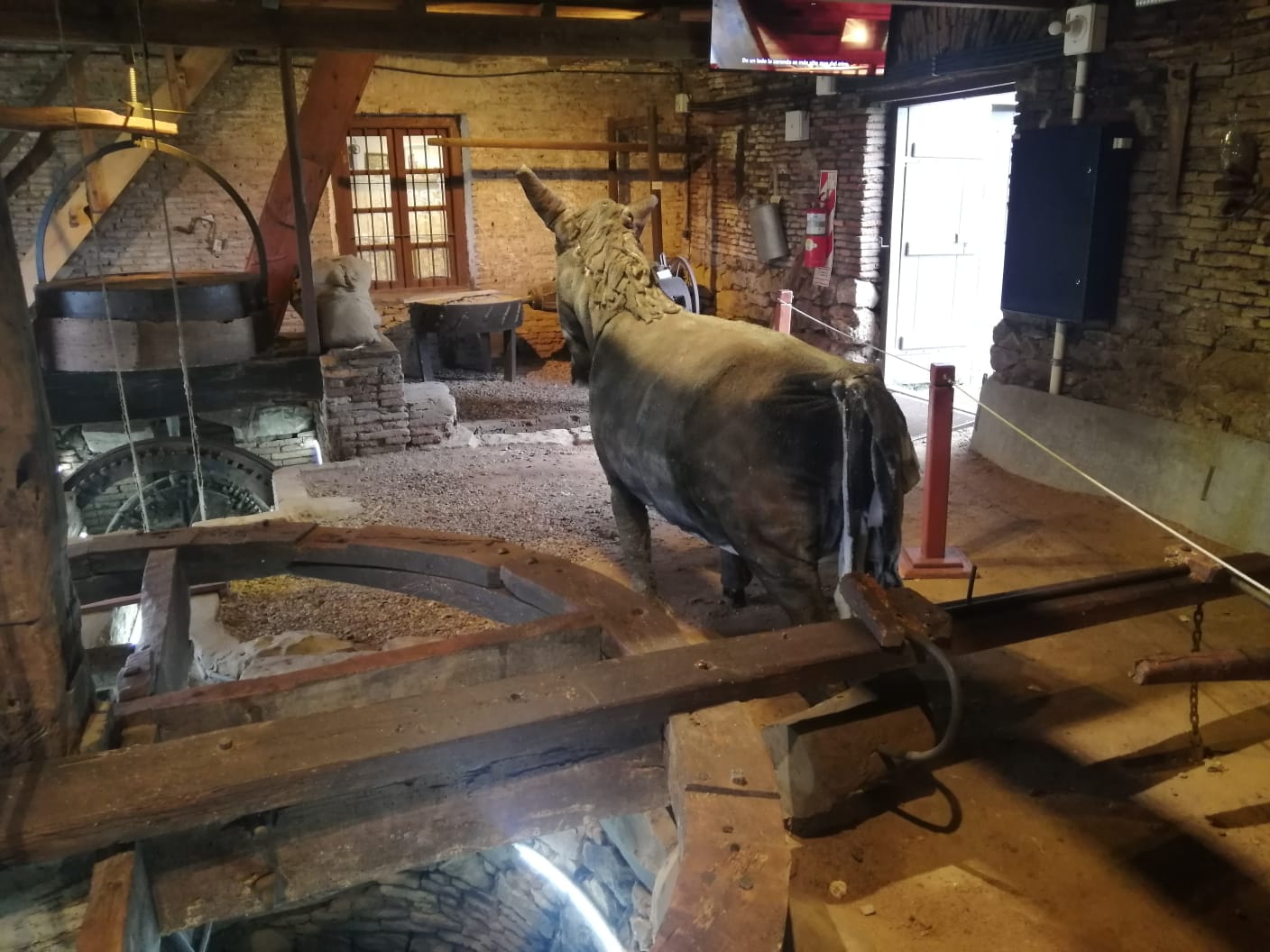MOLINO A MALACATE Construído en madera, la máquina que usa para su movimiento la energía suministrada por tracción a sangre de mulas que giraban con los ojos vendados para no marearse. El malacate acciona las piedras molas, estas muelen el grano, la harina sube al primer piso a través de una cinta que lleva al tamiz , donde la harina es separada en harina fina o gruesa