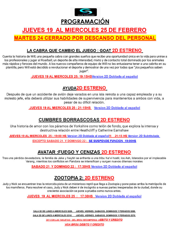 CINE PROGRAMACIÓN DE CINE SARANDÍ [DEL JUEVES 19 AL MIÉRCOLES 25 DE FEBRERO] febrero 17, 2026 Compartir Facebook Copiar link Dejá tu comentario (no es obligatorio poner e-mail) Cancelar respuesta Δ